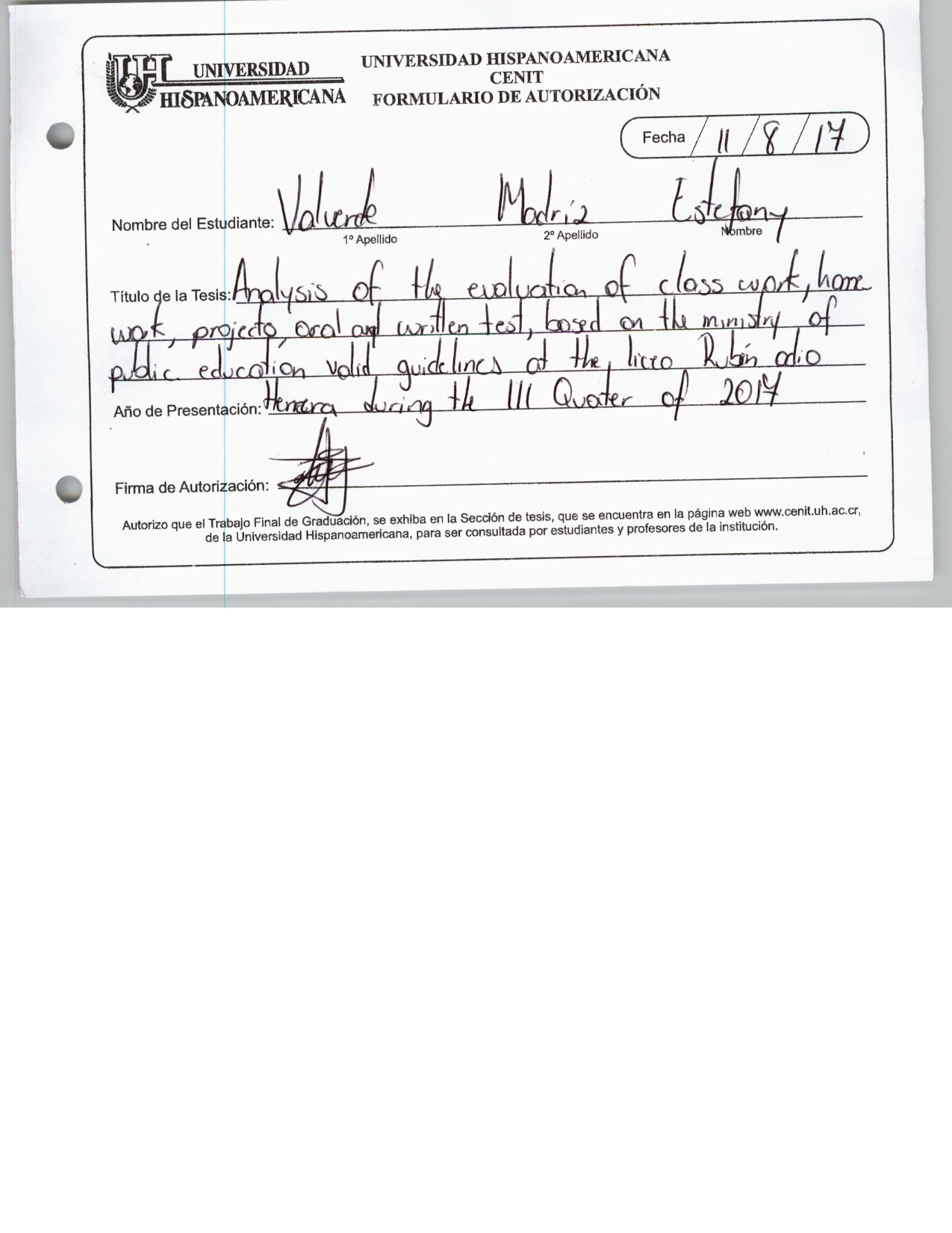 Analysis of the evaluation of class room homework projects oral and written tests based on the ministry of public education valid guidelines at Liceo Ruben Odio Herrera during the III quarter of 2016