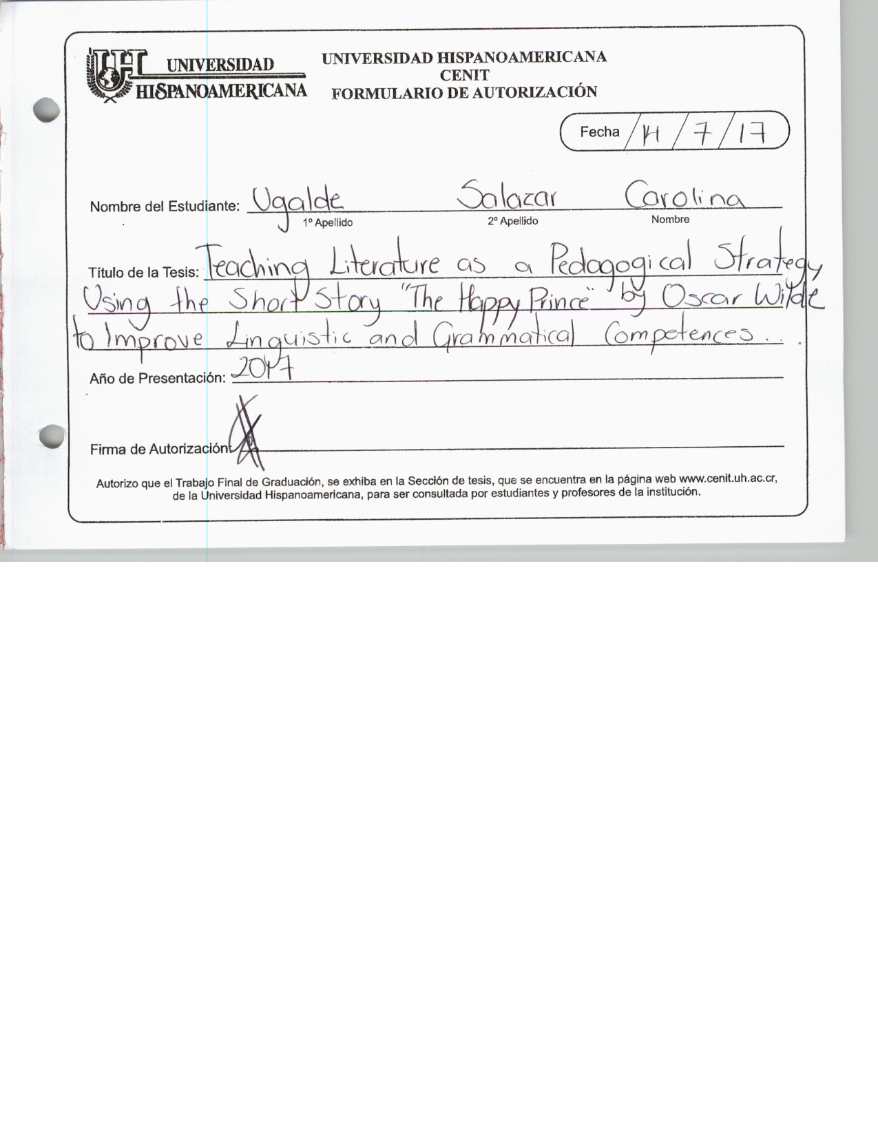 Teaching literature as a pedagogical strategy using the short story the happy prince by Oscar Wilde to improve linguistic and grammatical competences in students of seventh grade at centro educativo horizonte 2000 in the first period of the year 2017